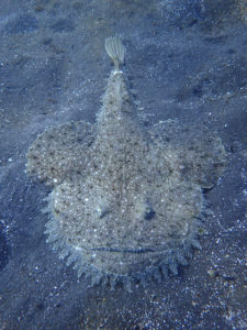 前日に同じゲストさんとキアンコウ2個体に会えたので、今日は違うコースで潜りましたが、砂地に出てすぐの浅場でまた会えました。