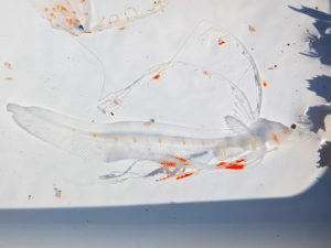 ガッカリして朝の海況チェックをしていたところ、なんと透き通ったシャチブリの稚魚がタモ網を持った人に捕獲されていました。複雑な心境でしたが、写真を撮らせてもらいました。