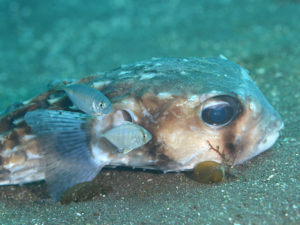 低水温で命尽きたばかりのイシガキフグにカイワリたちが付いていました。
