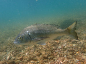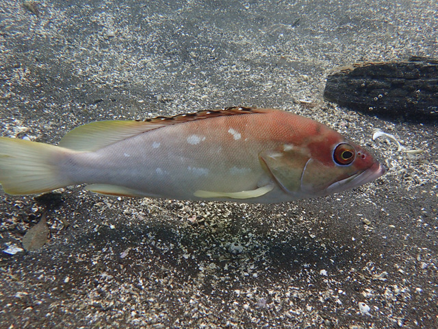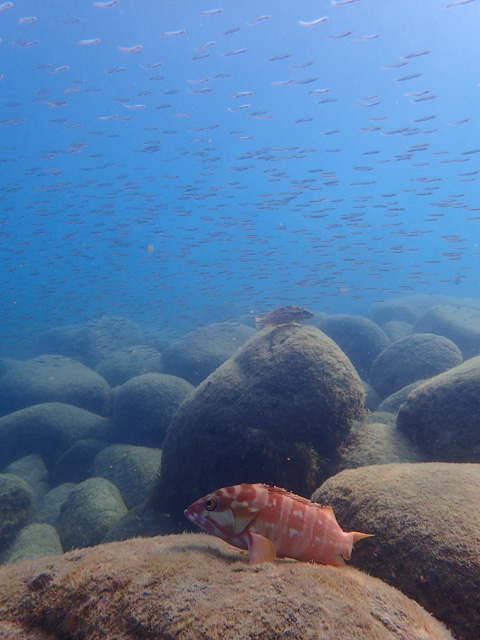 アカハタの個体数はここのところ多くて、他の魚と同じく水温が上がっているこの時期はとくに食欲旺盛で、飢えている感が伝わってきます。