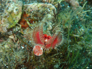 昨日ほどではないですが、少し水温が上がっていたので、最近見られなくなっていたアケボノハゼの所へ行ったら、なんとホバーリングしていました。でも少し寄ったら巣穴の方向を向いて、その後は巣穴に入ってしまいました。