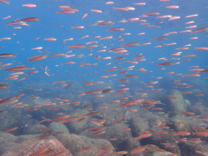 中央付近の赤い魚はホカケハナダイの幼魚。