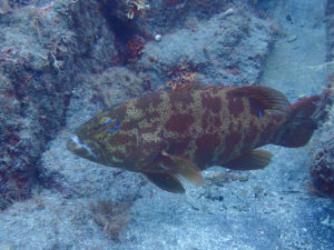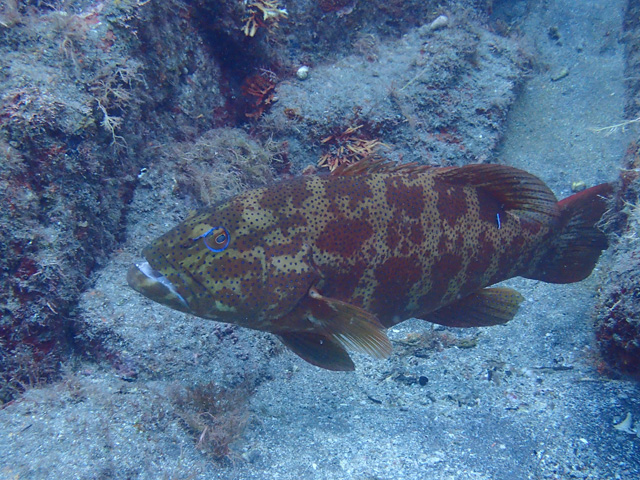 ハゼの巣穴の入口で獲物を狙ってるオオモンハタ。
